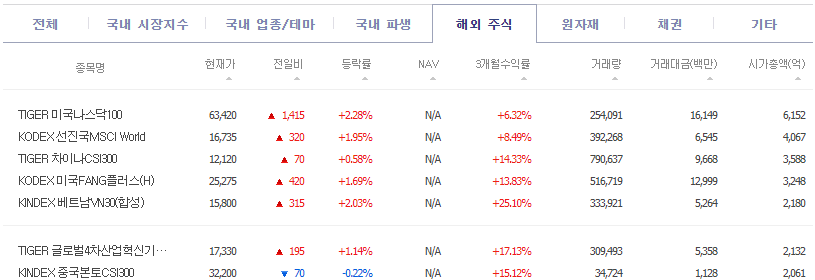 네이버금융에서 국내증시 정보를 보면 ETF 상품을 확인하실 수 있습니다.