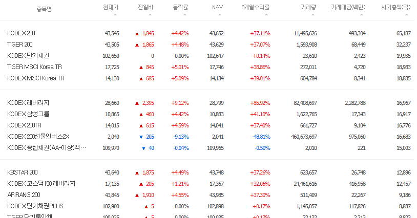 KODEX200, TIGER200, 등등 각각의 상품명은 각 상품의 정보를 표시하고 있습니다.