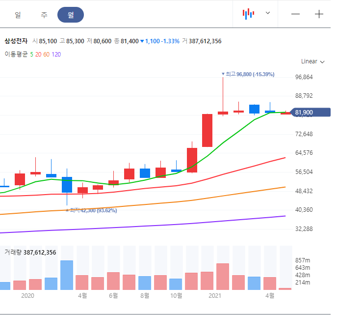 위 차트는 삼성전자 최근 주식 차트입니다.