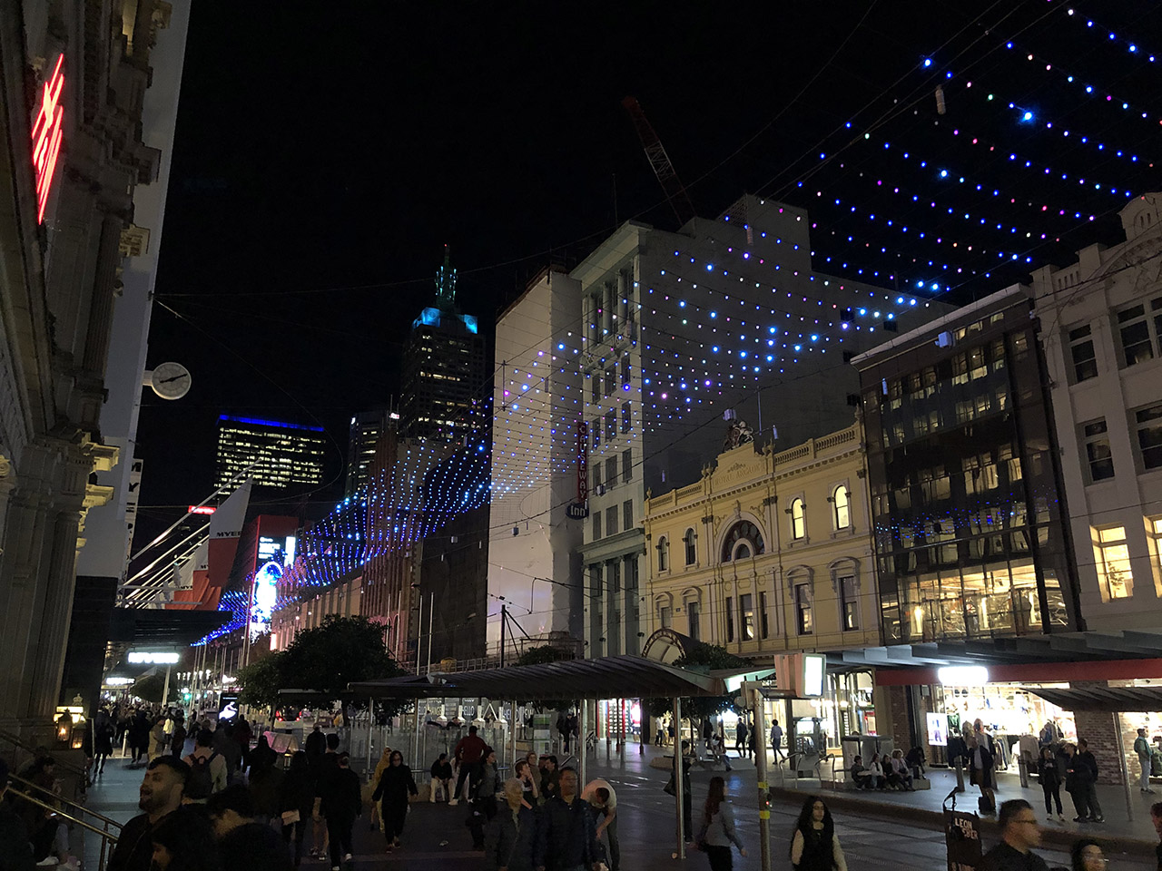 조명이 정말 예쁘죠? 수많은 사람들이 길거리에 모여서 얘기도 하고 음식도 먹고 사람 구경도 하고 사진도 찍고 멜버른의 저녁 밤을 즐기고 있습니다.