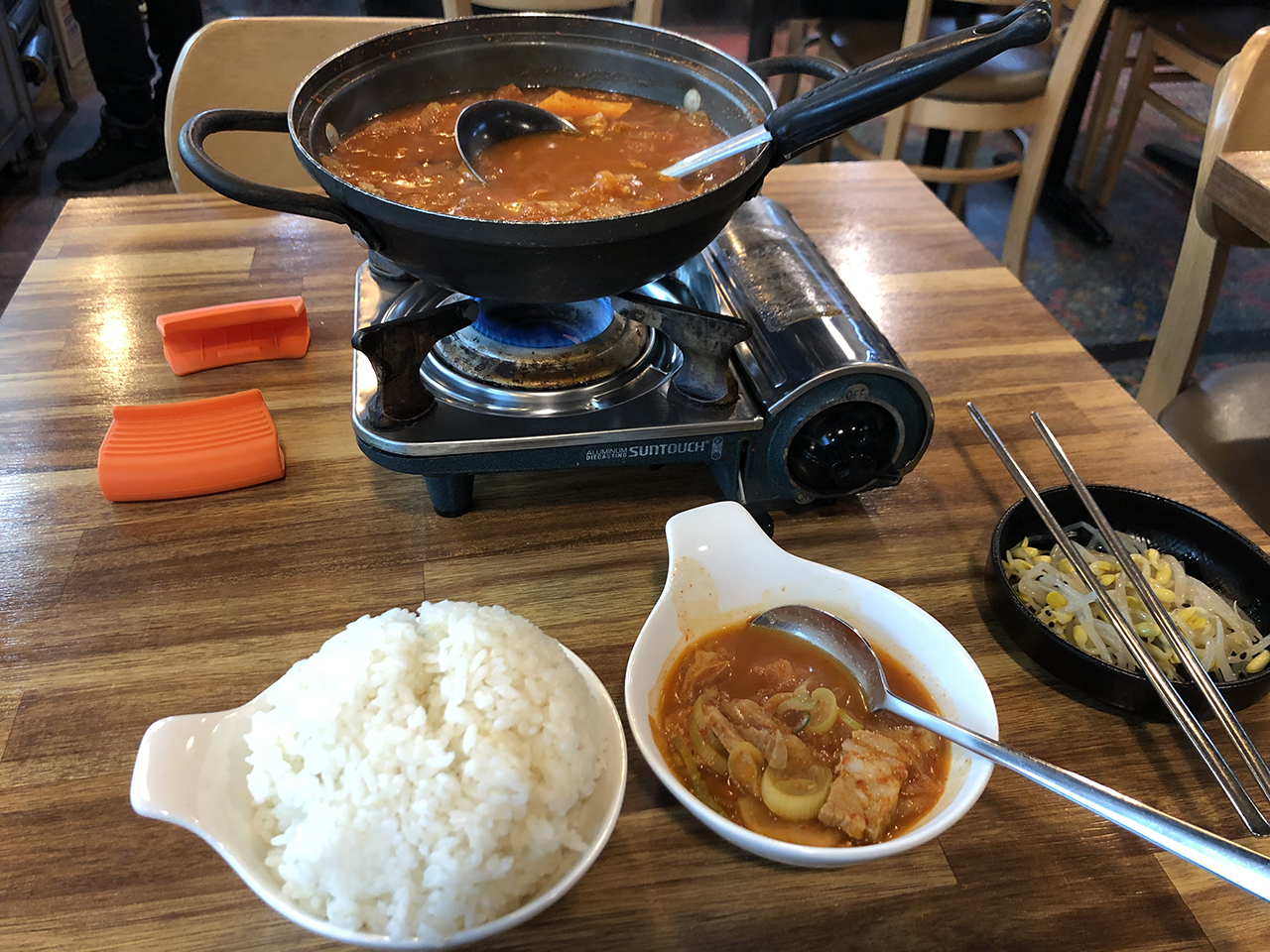 청년밥상 문간의 3천원 김치찌개입니다. 김치, 돼지고기, 두부 등 재료가 아주 푸짐해서 놀랐습니다. 게다가 공깃밥과 콩나물 반찬이 무제한입니다.