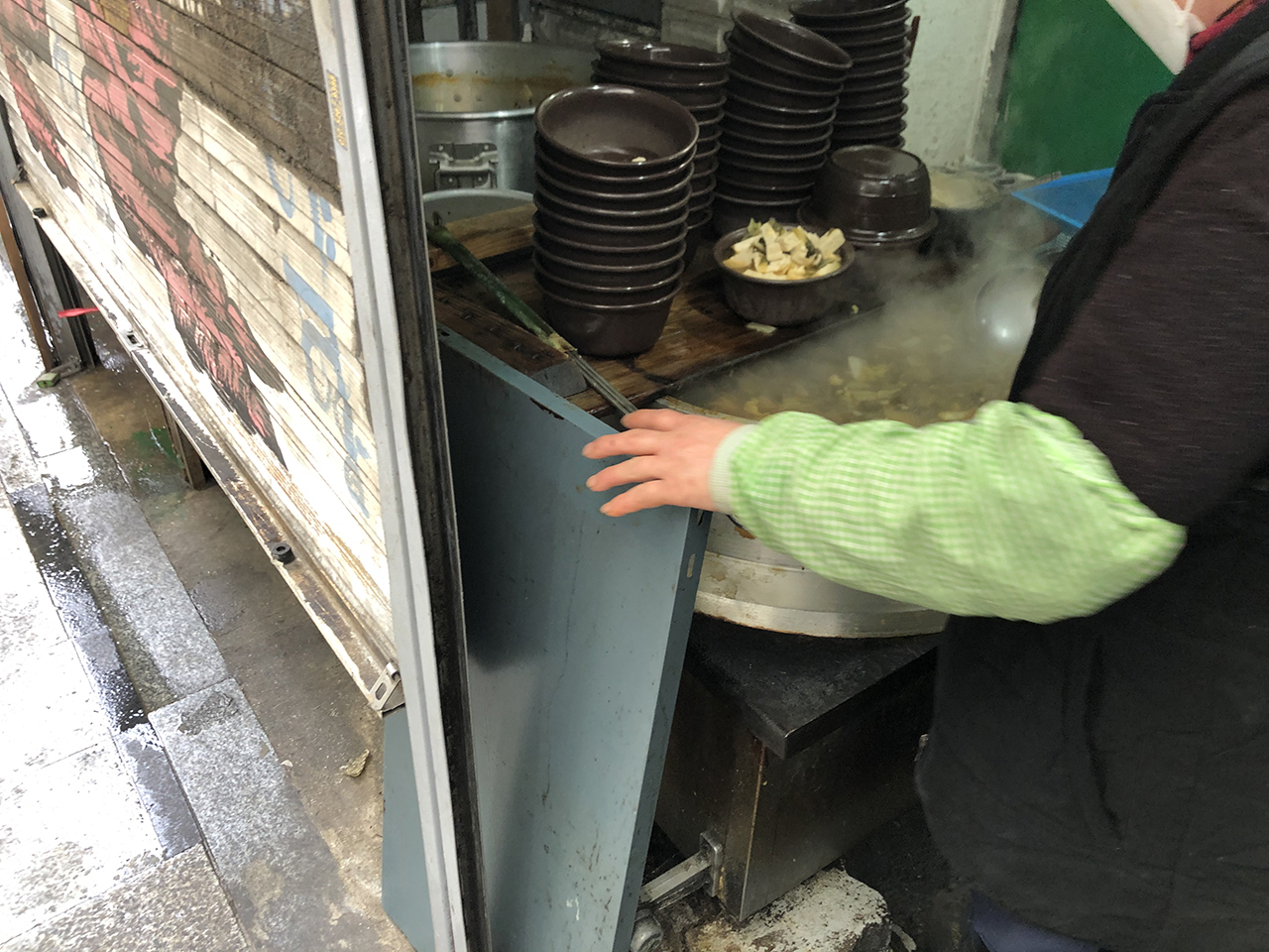 큰 솥에 하루종일 우거지를 끓이면서 주문 즉시 담아 주는 방식입니다. 그래서 굉장히 빨리 나오고요. 당연히 국물 재활용도 없습니다.