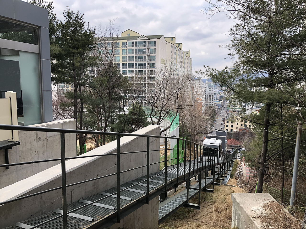 대현산배수지공원으로 가는 계단은 평균 30도 정도라고 합니다. 등산을 하는 분들은 잘 아시겠지만 30도면 꽤 급경사라 할 수 있는데요. 이렇게 힘든 경사를 모노레일 덕분에 편하게 올라갈 수 있게 되었습니다.