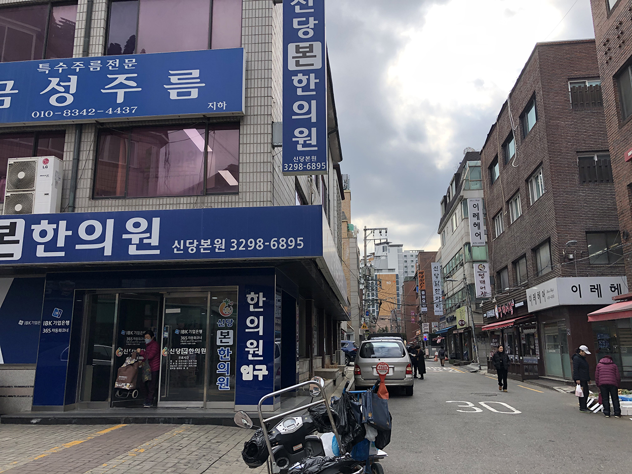 신당 현대아파트 앞까지 왔습니다. 여기서부터는 모노레일이 잘 보입니다. 저기 앞에 모노레일 선로가 경사를 따라 설치된 모습이 보이시죠?