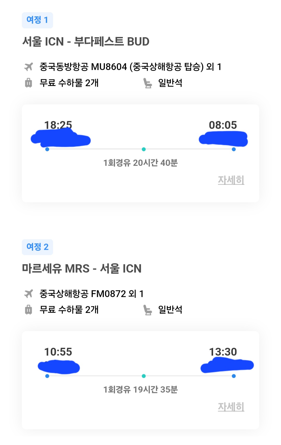 저는 인천에서 상하이를 경유하여 헝가리 부다페스트로 들어갔다가, 프랑스 마르세유에서 상하이를 경유하여 인천으로 돌아오는 다구간 항공권을 구매했습니다. 경유 시간을 포함하면 각각 총 20시간 내외로 소요되는데요. 가격이 워낙 싸기 때문에 체력이 좋은 분들에게는 충분히 좋은 선택이 될 수 있습니다.