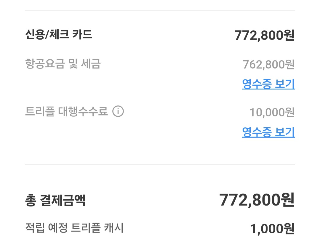 구매 시기는 출발하기 딱 2달 전이었고요. 트리플을 통해 예매하였습니다. 스카이스캐너에서 검색을 하면 해당 항공권을 파는 다양한 사이트를 선택할 수 있는데요. 이상해 보이는 해외사이트가 좀 못미더워서 제가 이미 사용해 본 적이 있는 트리플을 이용했고 결과적으로 아무 문제 없이 정상적으로 진행되었습니다. 참고로 트리플이 항상 싼 건 아니고, 그때그때 다릅니다.