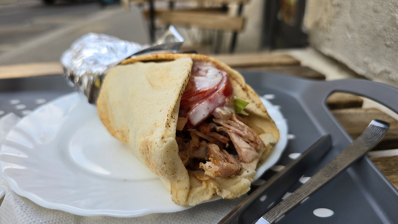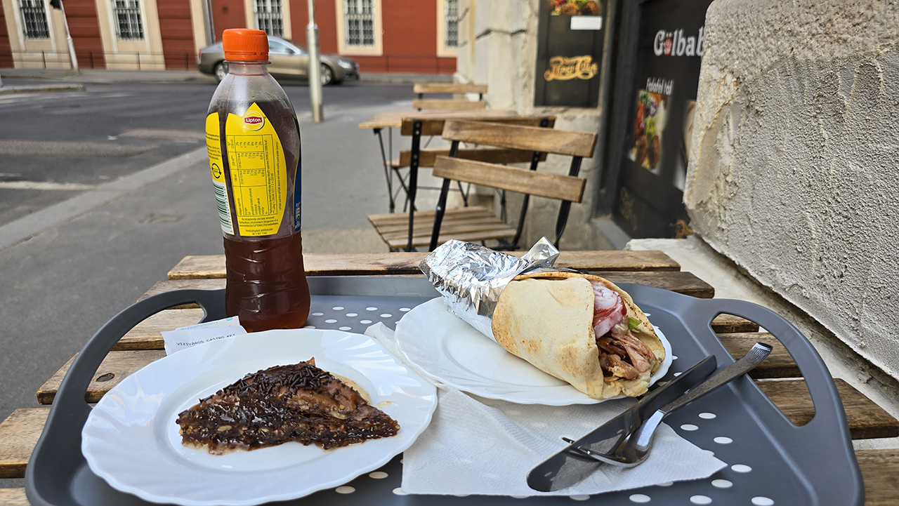 제가 시킨 메뉴입니다. 내부는 더워서 야외 좌석에 앉았는데요. 케밥+음료 2000포린트, 바클라바 550포린트로 총 2550포린트가 나왔습니다. 한국 돈으로 약 9,890원입니다.