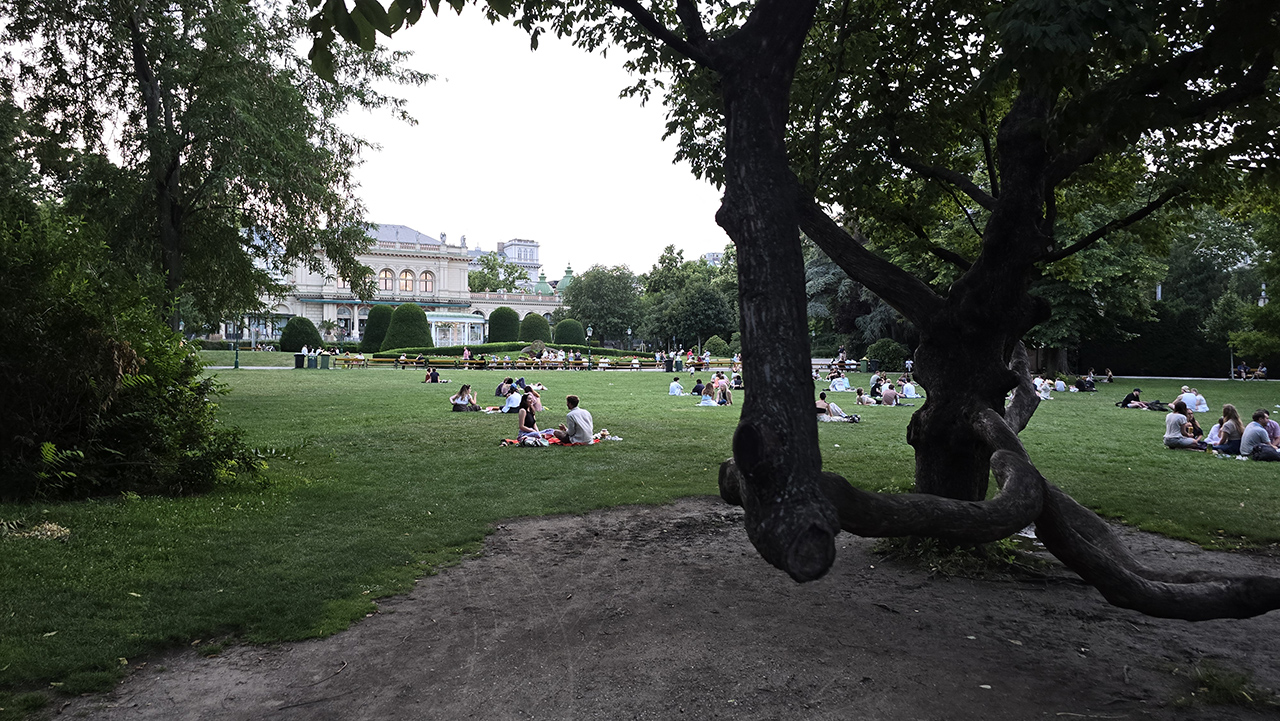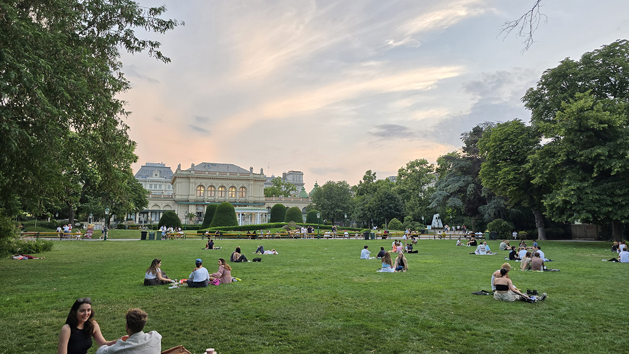 사람이 가장 많은 잔디밭이었습니다. 앞에 보이는 건물은 쿠어살롱(Kursalon Wien)입니다.