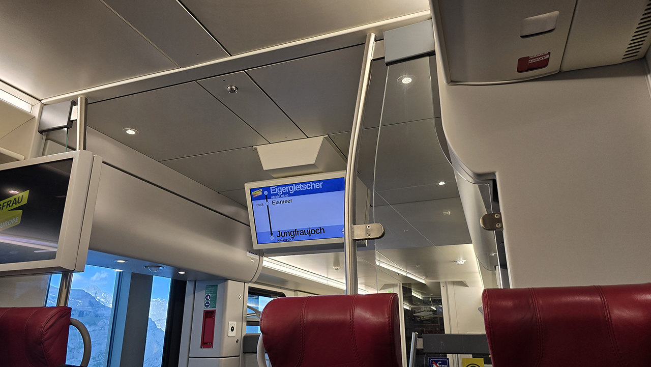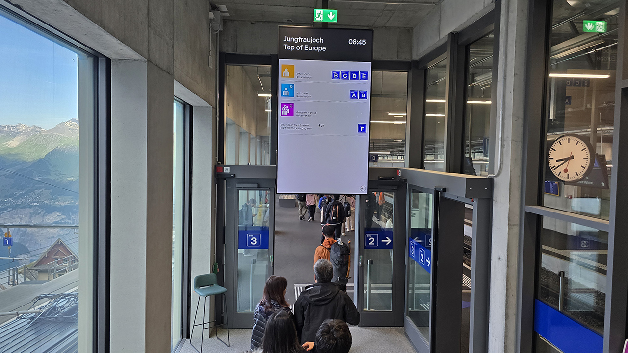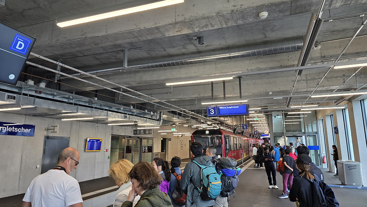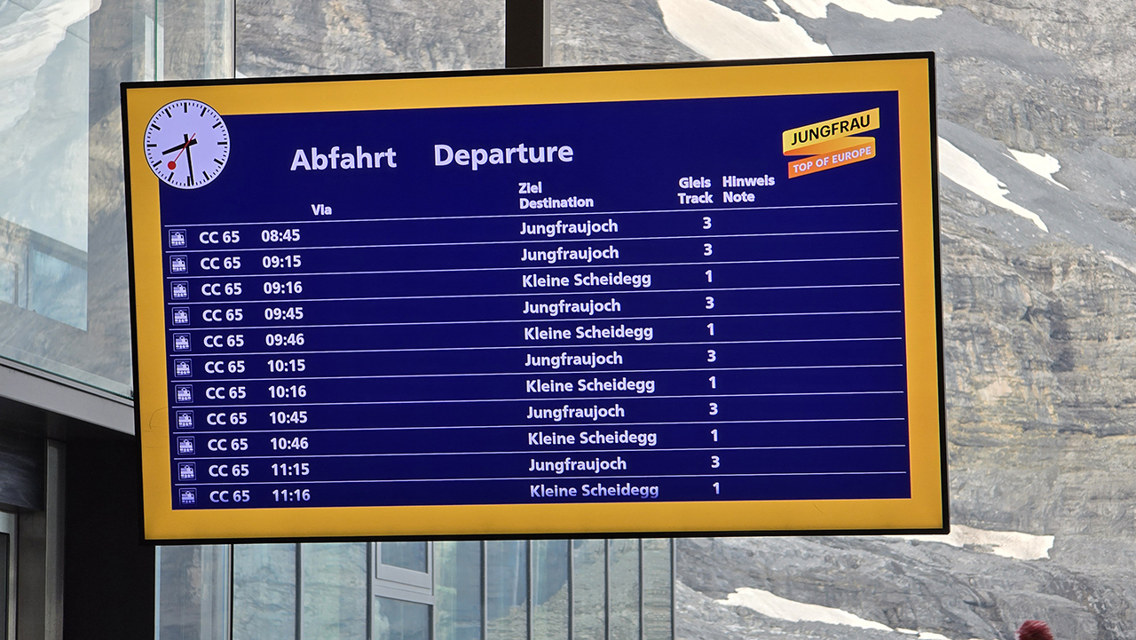 기차 타는 곳입니다. 전광판에서 융프라우요흐(Jungfraujoch)를 확인하세요.