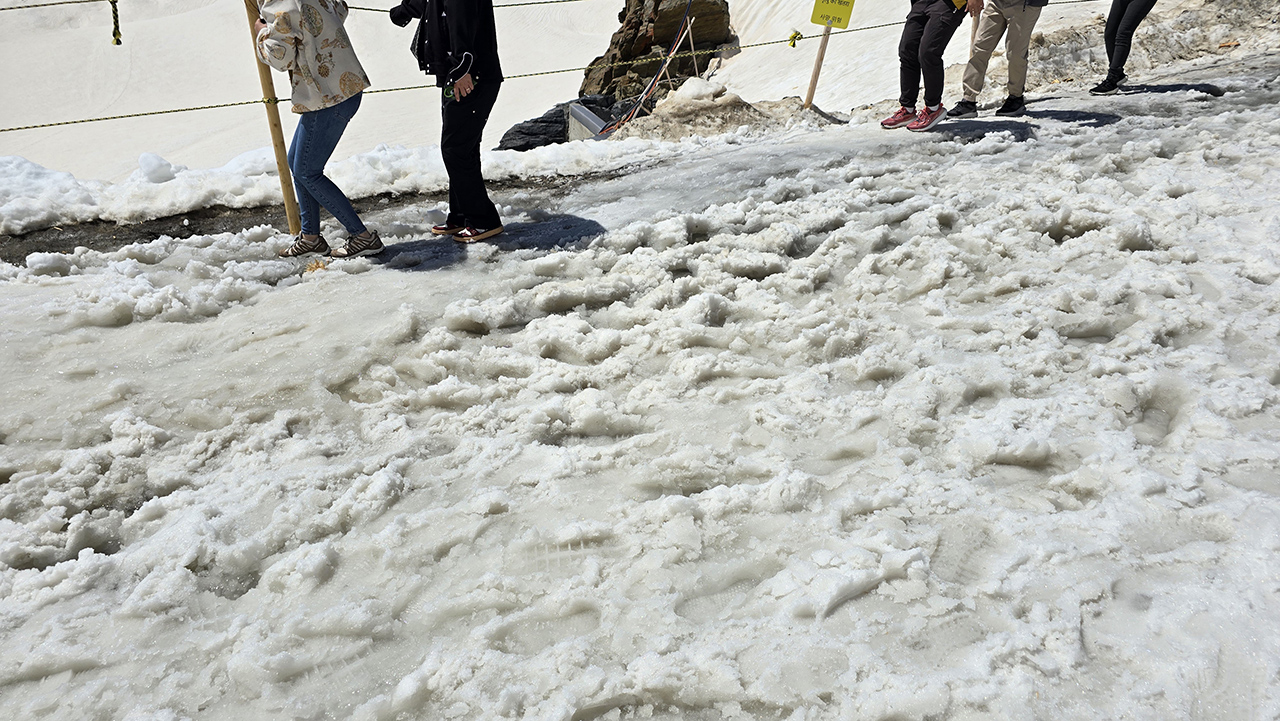 여름 시즌에 오면 이렇게 눈이 질척입니다. 신발에 물 안 들어가도록 조심하세요.