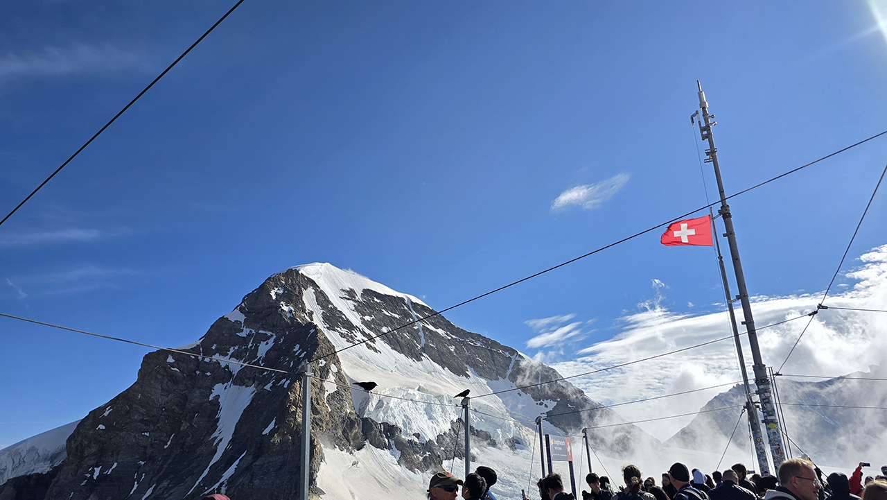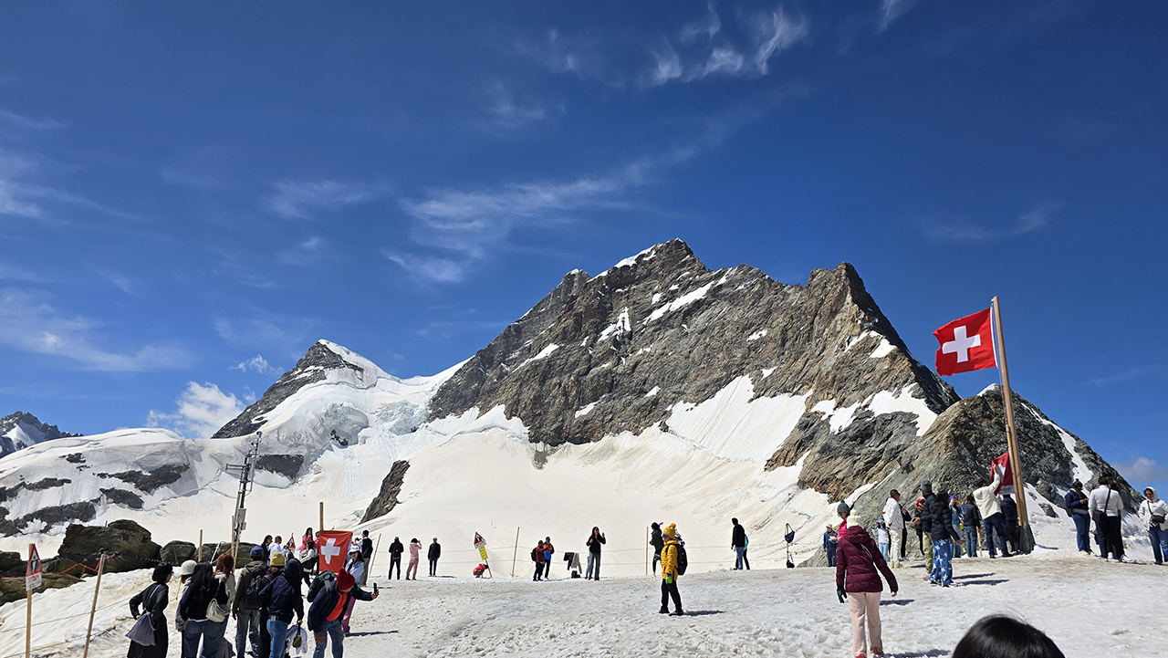 스위스 국기와 융프라우를 배경으로 사람들이 사진을 찍고 있습니다. 융프라우 사진을 검색해 보면 많이 나오는 포토존이 바로 저기입니다.