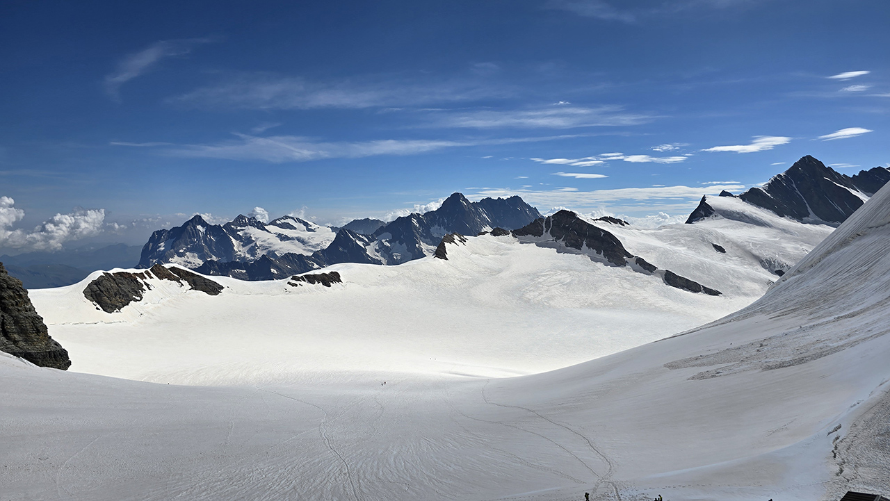 이따가 가게 될 알레취 빙하 방향입니다. 아래에 사람들이 개미처럼 보입니다. 왼쪽 산은 Monch, 오른쪽 산은 Trugberg입니다.