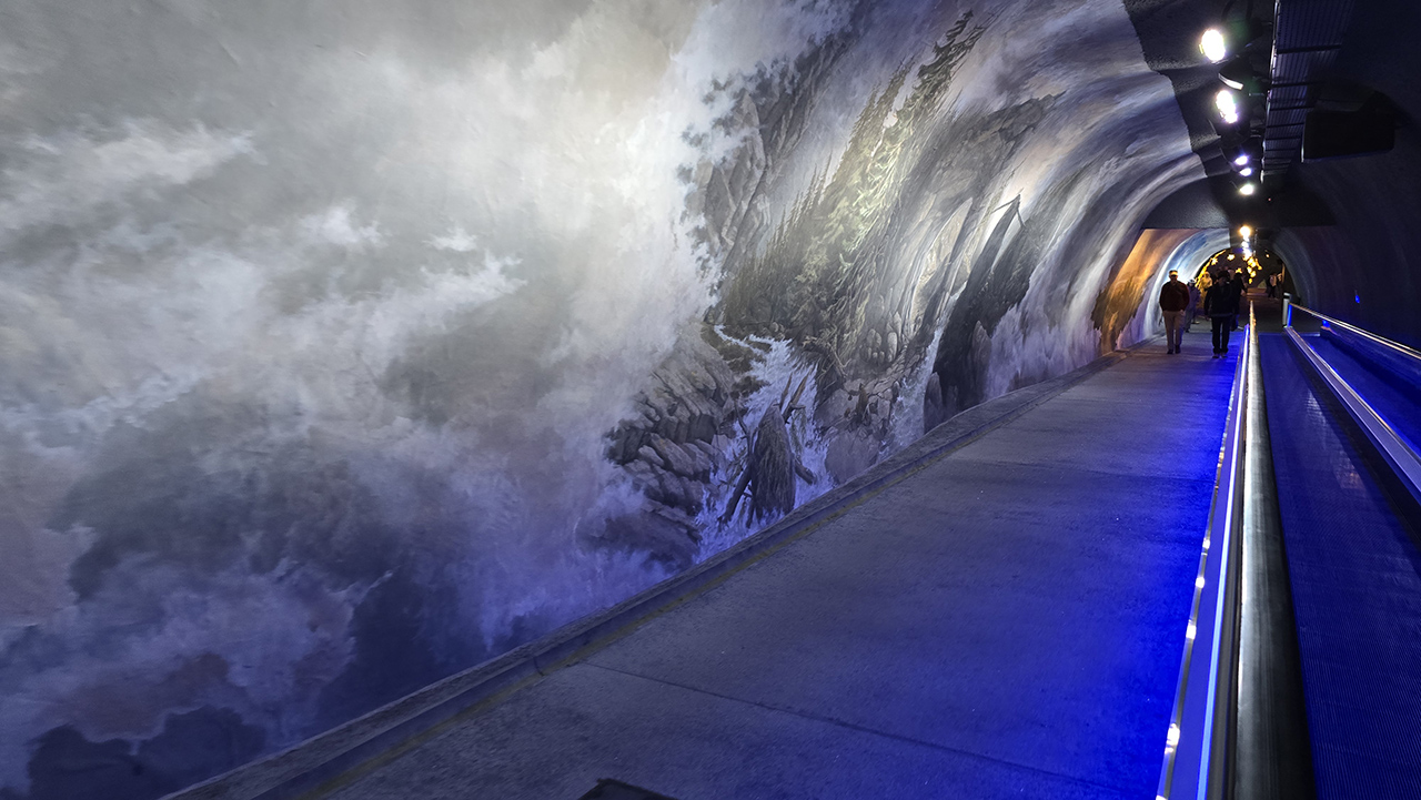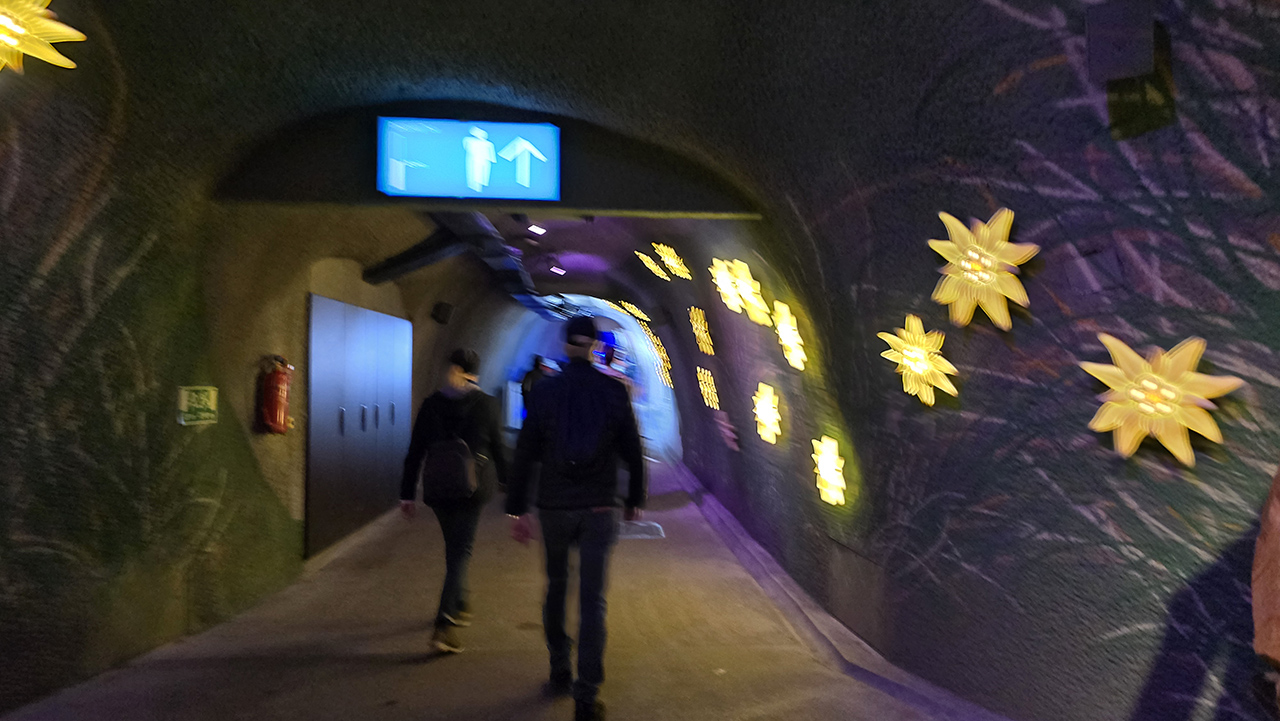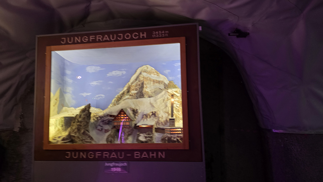 플라토 전망대로 가는 길에는 알파인 센세이션이라는 것이 있습니다. 이곳은 플라토 전망대까지 이어지는 250m 길이의 터널입니다. 융프라우 산악열차의 100년 역사에 대한 기록이 전시되어 있습니다. 사진에 보이는 것은 융프라우 마을을 표현한 대형 스노우볼입니다.