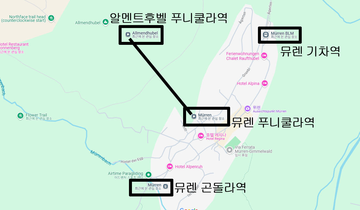올라갈 때랑 다른 점은 [뮤렌 곤돌라역 ~ 뮤렌 기차역] 도보 이동입니다.