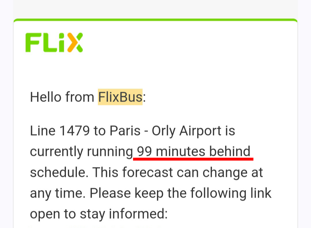 메일을 확인해 보니 플릭스버스 지연 메일이었습니다. 99분 지연이라고 안내되어 있었는데요. 이때는 몰랐습니다. 이것이 악몽의 시작일 줄은...