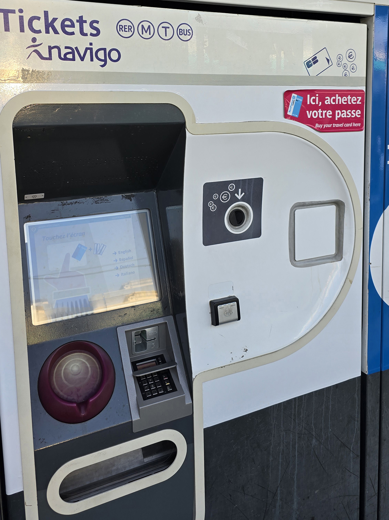 나비고 카드 발행 기계입니다. 카드를 구매하고 원하는 티켓을 충전하면 됩니다. 결제는 현금도 되고 카드도 됩니다. 저는 트래블월렛으로 결제했습니다. 트래블월렛이 교통카드도 되면 좋을텐데 파리 교통권 시스템이 워낙 엉망이라서 호환히 힘든 거 같습니다. 그래서 컨택트리스 신용카드도 교통카드가 안 됩니다.