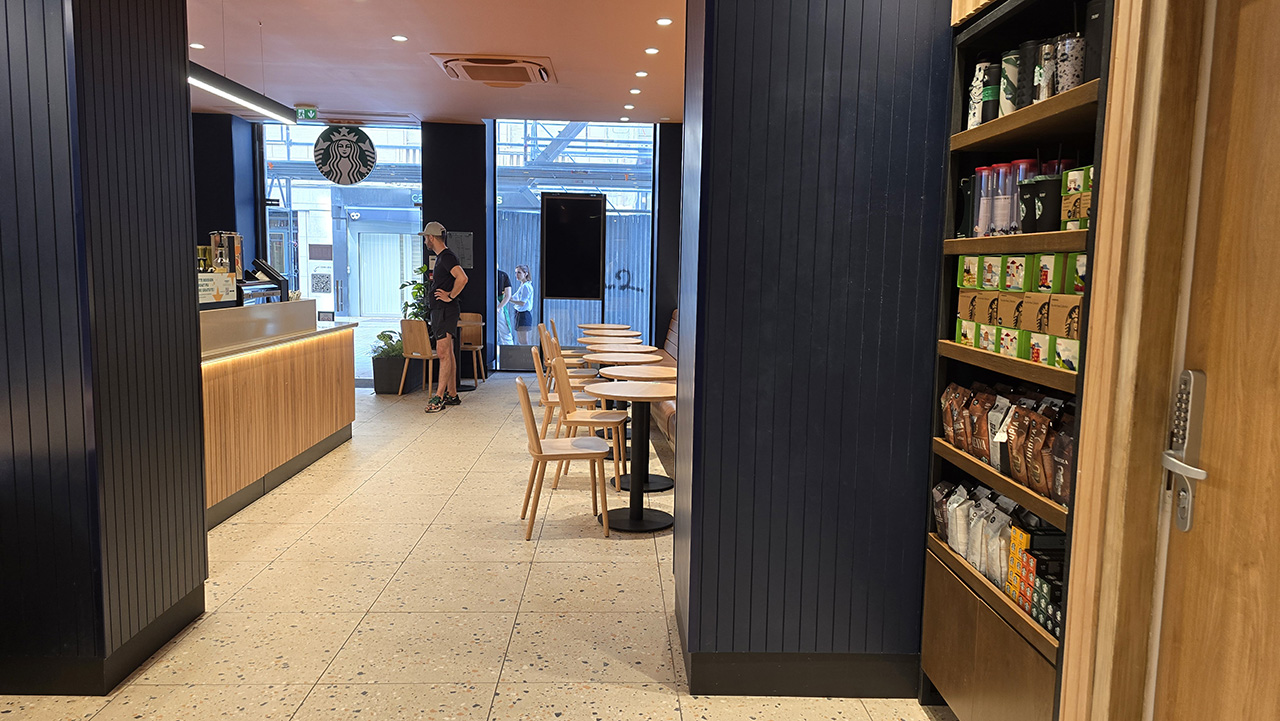 스타벅스 매장 안쪽입니다. 넓은 공간이 있고 자리도 많습니다. 중간에는 단체석도 있습니다.