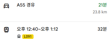 먼저 구글 지도에서 검색해 보면 차로 가는 방법과 공항버스로 가는 방법이 나옵니다. 차로 가면 약 21분 소요되고. 공항버스로 가면 약 30분 소요되는데요. 아래에서 간단히 정리해 봅시다.