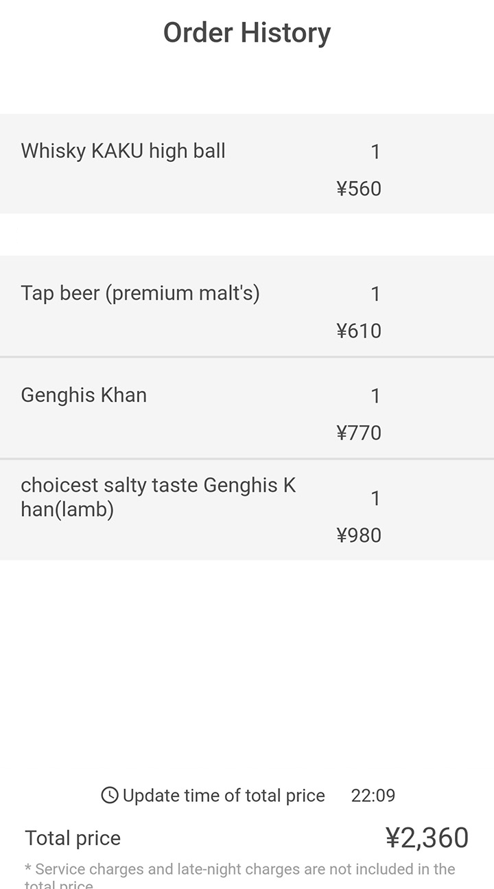 총 주문 내역은 위와 같습니다. 이제 보니까 기본 징기스칸이랑 소금맛 징기스칸을 주문했었네요. 그리고 맥주 한 잔이랑 하이볼 한 잔을 주문했습니다. 총금액은 2,360엔이 나왔습니다. 한국돈으로 현재 환율 기준 23,150원인데요. 엔화가 무섭게 치솟고 있네요. 쌀 때 더 다녀올걸!
