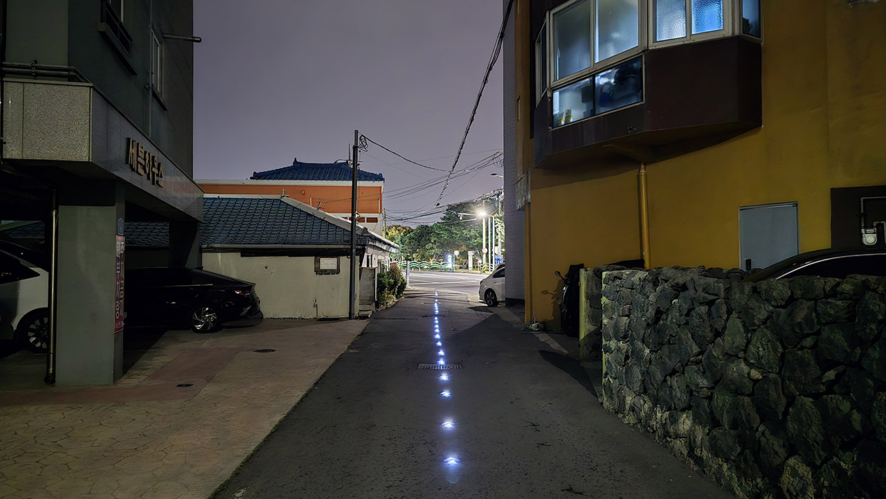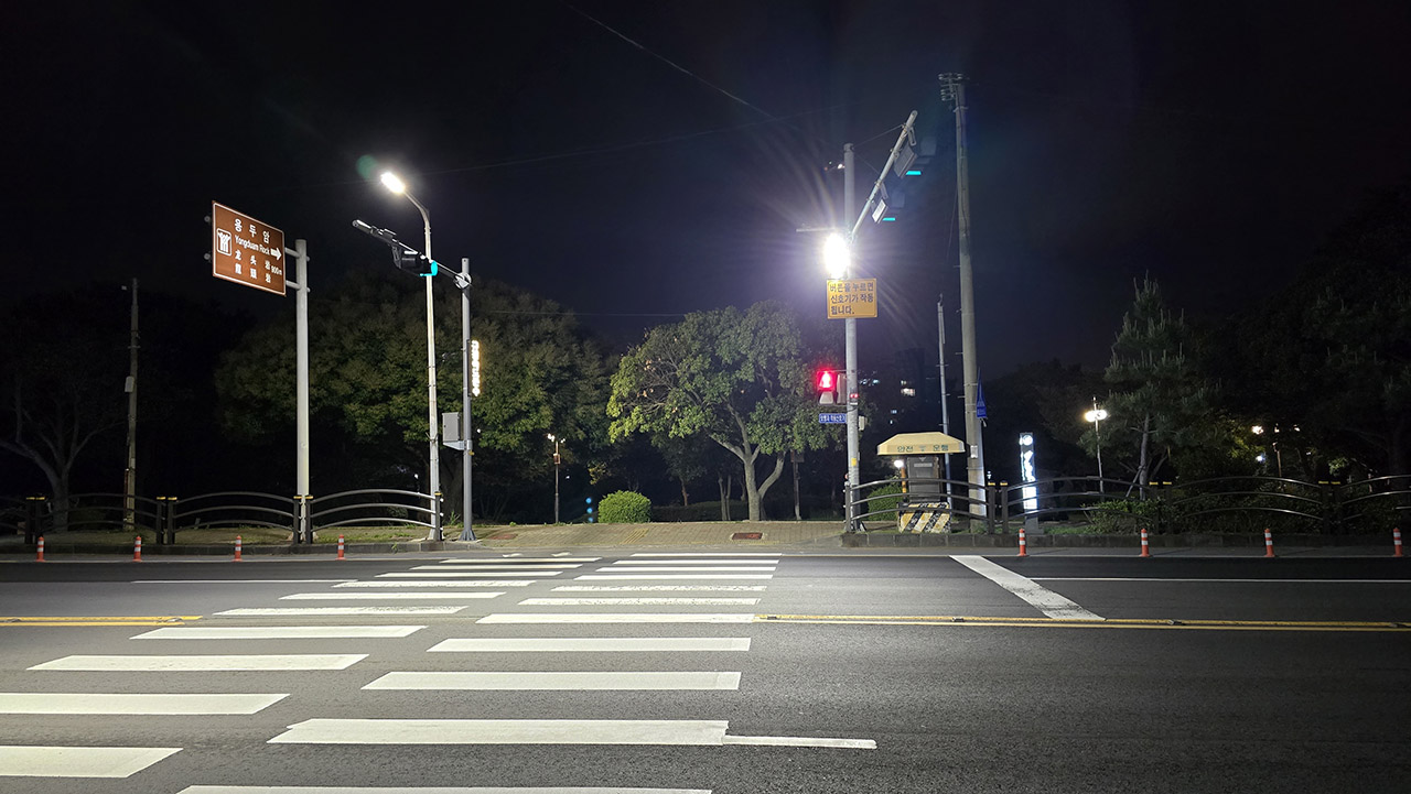 바닥 조명의 끝에는 이렇게 횡단보도가 나오고 건녀편에 용연계곡이 있습니다.