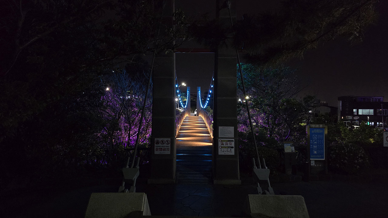 이렇게 생긴 다리가 나타납니다. 이 다리는 용연계곡 위에 있는 용연구름다리인데요. 야간에는 이렇게 예쁘게 조명이 켜집니다.
