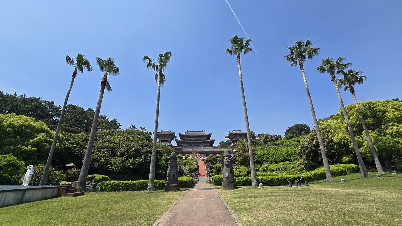 그럼 약천사 사진과 함께 본격적으로 경내를 둘러보겠습니다. 제주도 답게 높은 야자수가 세워져 있어서 이국적인 풍경을 냅니다. 인터넷에서 봤던 사진보다 나무의 키가 훨씬 컸습니다.