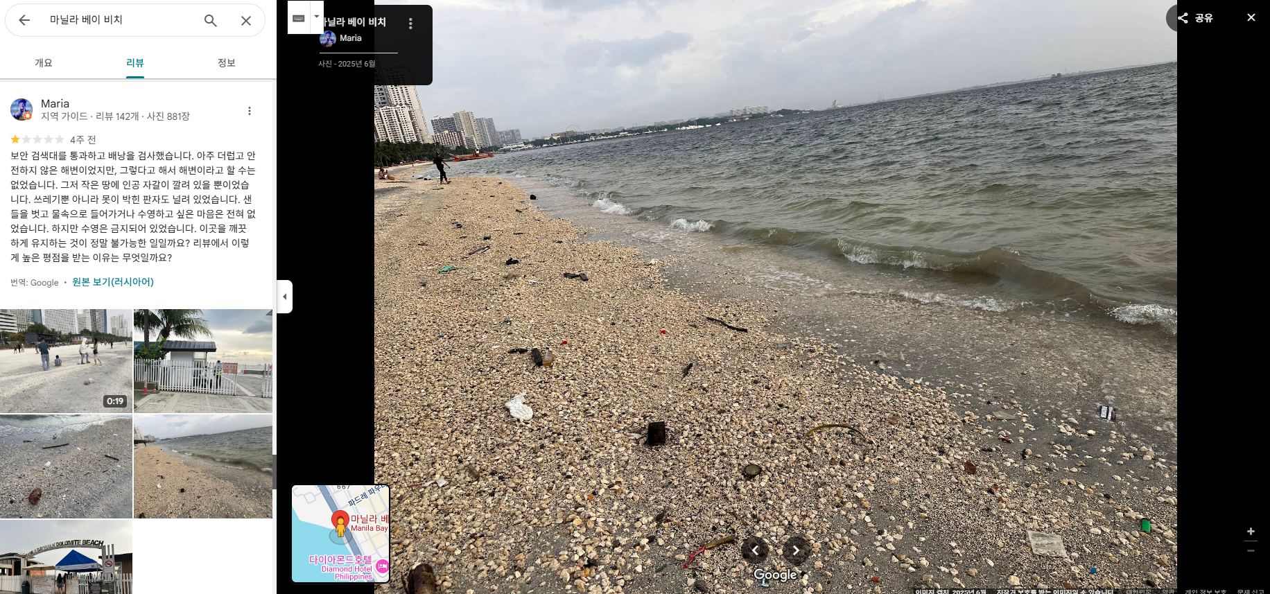 최신 구글 리뷰에 올라온 마닐라 베이 비치의 모습입니다. 해변은 더럽고 쓰레기로 가득합니다. 그래도 이 사람은 운 좋게 개방된 날에 가서 들어갈 수 있었던 거 같은데요. 마닐라 해변은 개방이 안 되는 날도 많아서 제가 갔을 때는 운 나쁘게도 출입 불가였습니다.