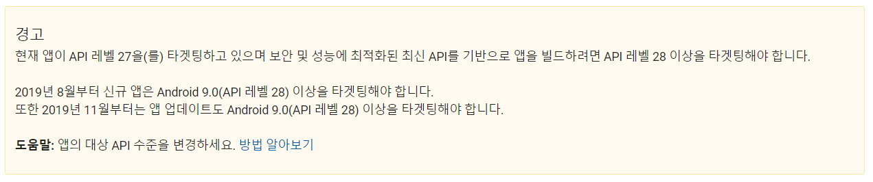 현재 앱이 API 레벨 27을(를) 타겟팅하고 있으며 보안 및 성능에 최적화된 최신 API를 기반으로 앱을 빌드하려면 API 레벨 28 이상을 타겟팅해야 합니다.