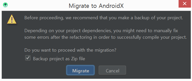 메뉴에서 [Refactor] - [Migrate to AndroidX...] 을 눌러주자.