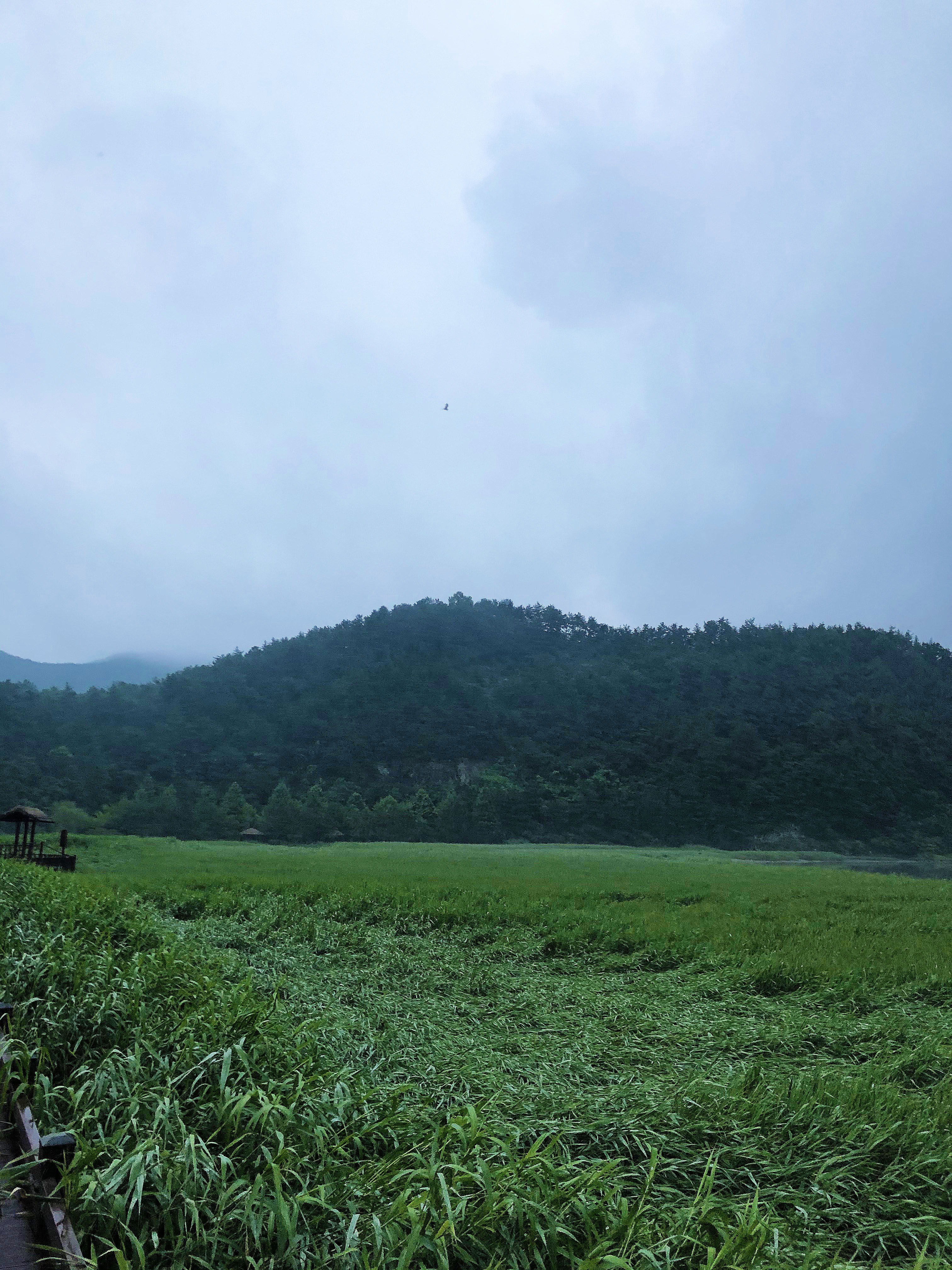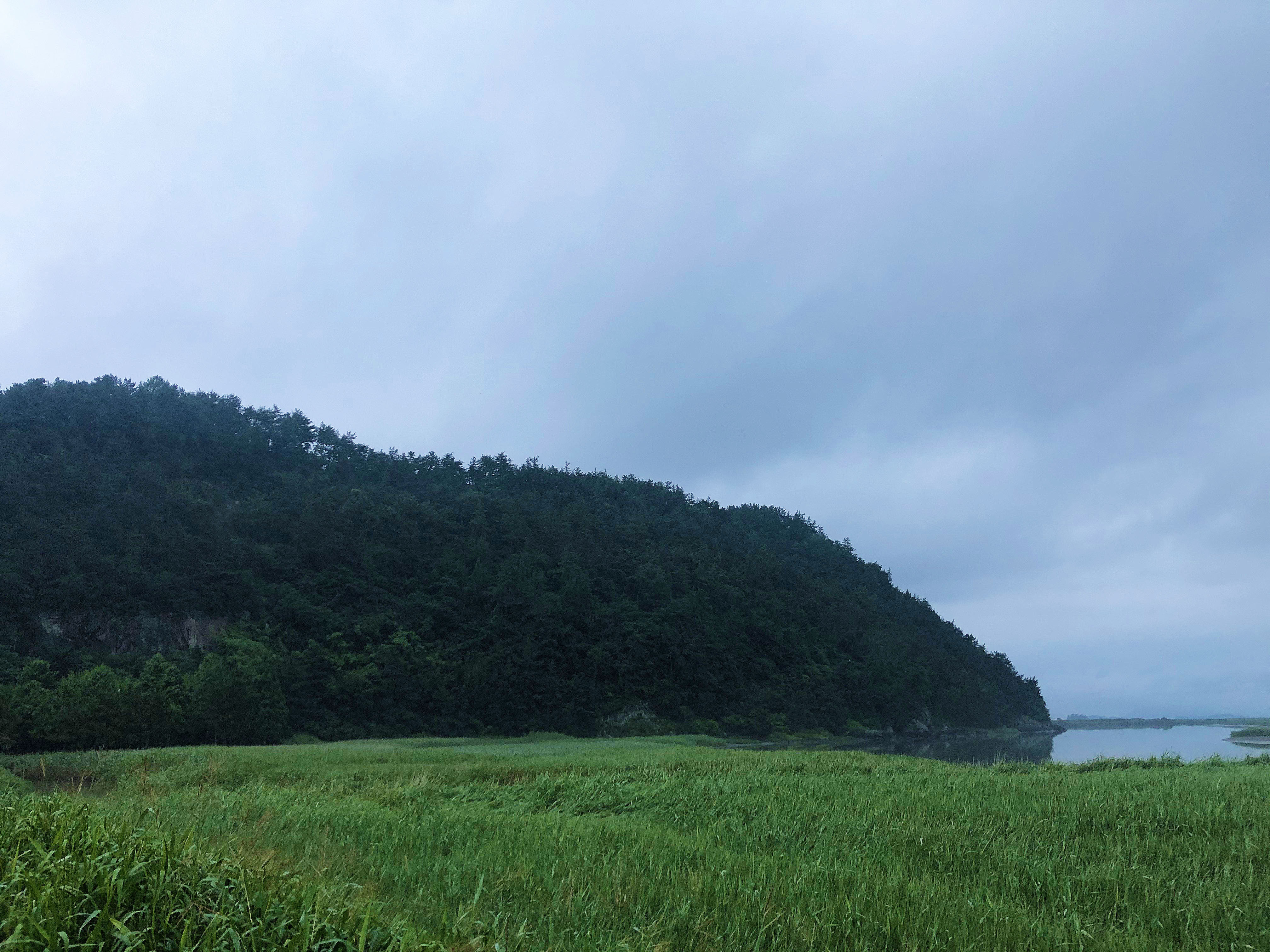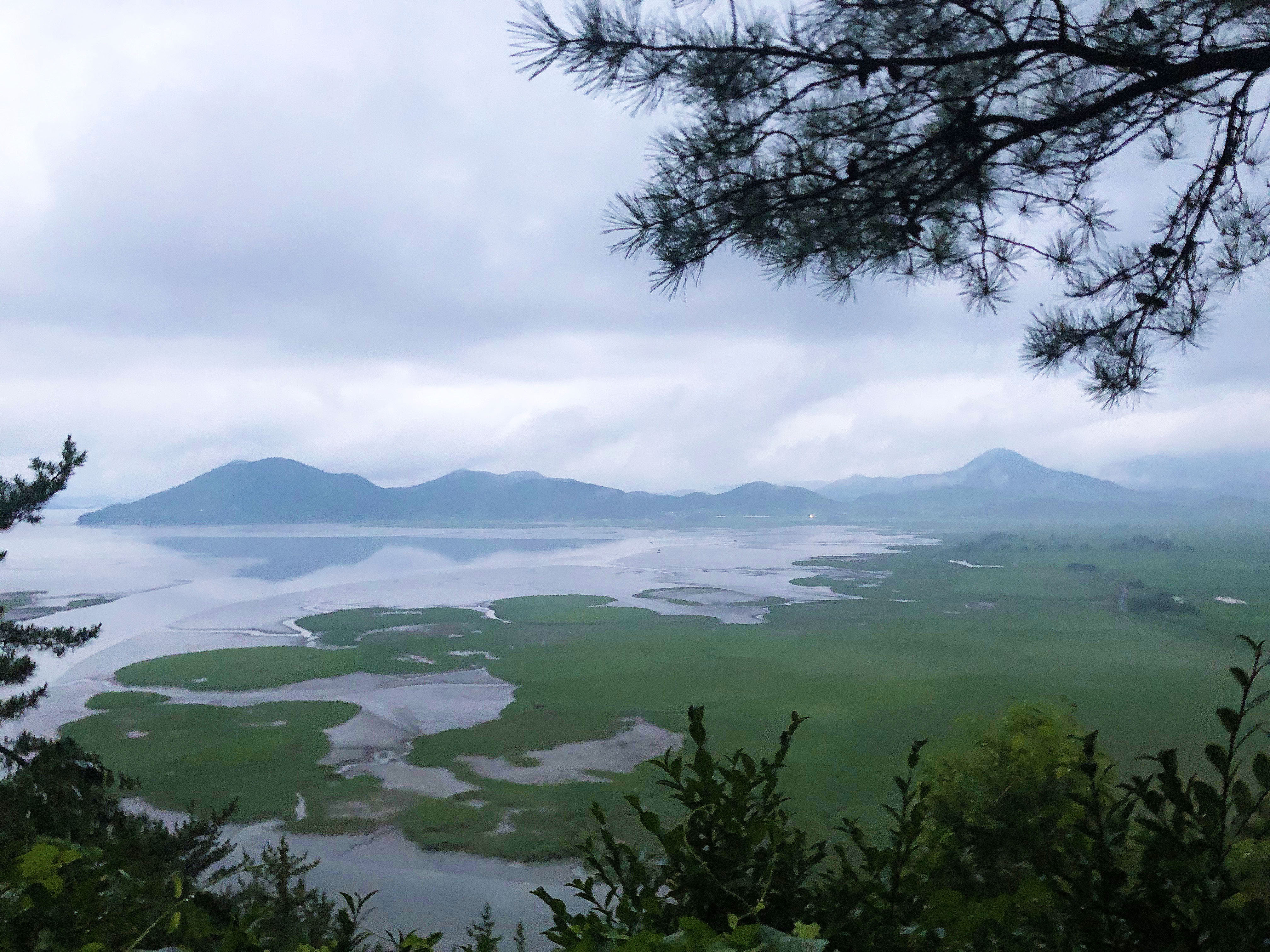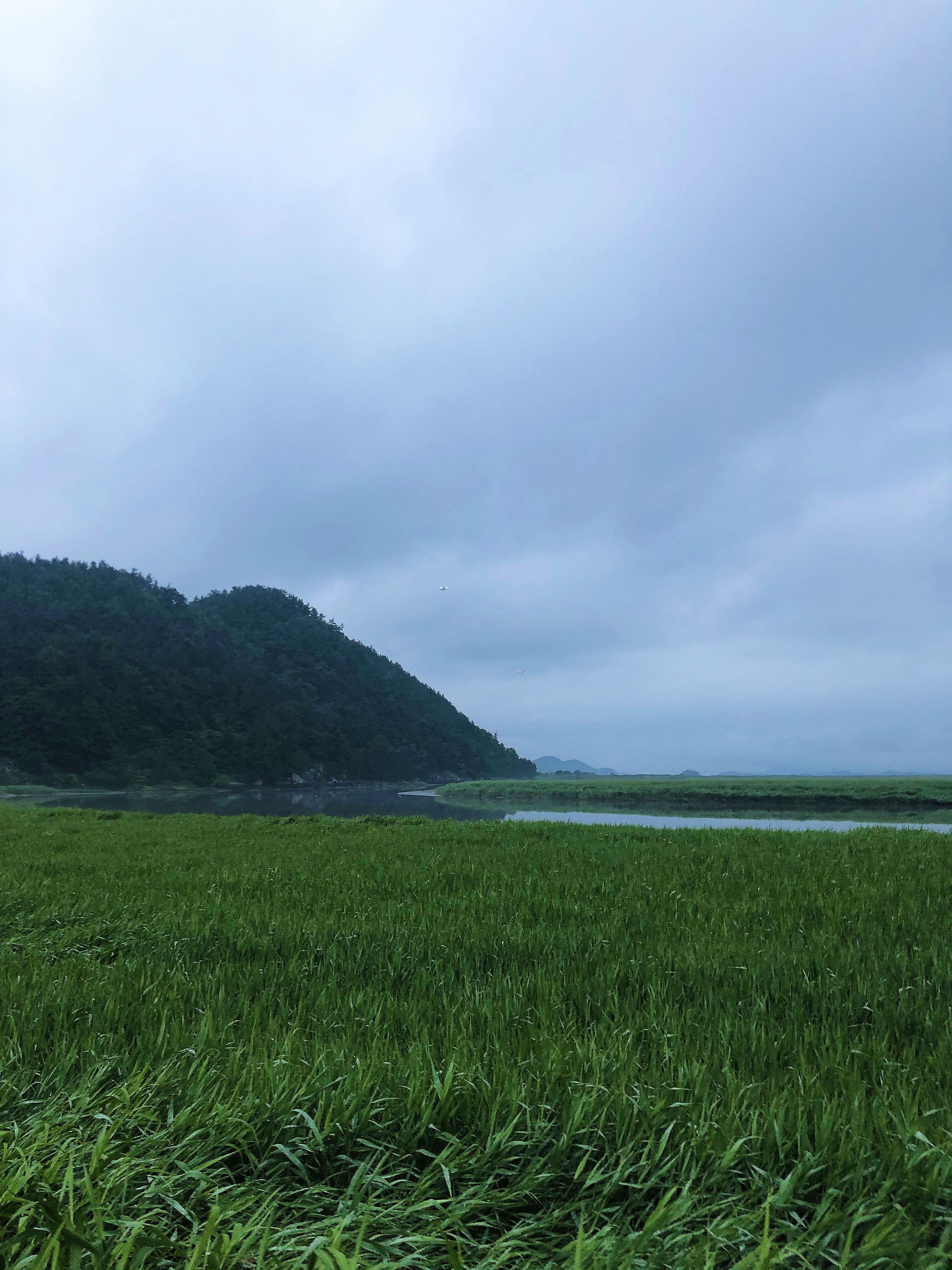 습지와 습지 뒤의 산과 구름이 어우러진 모습은