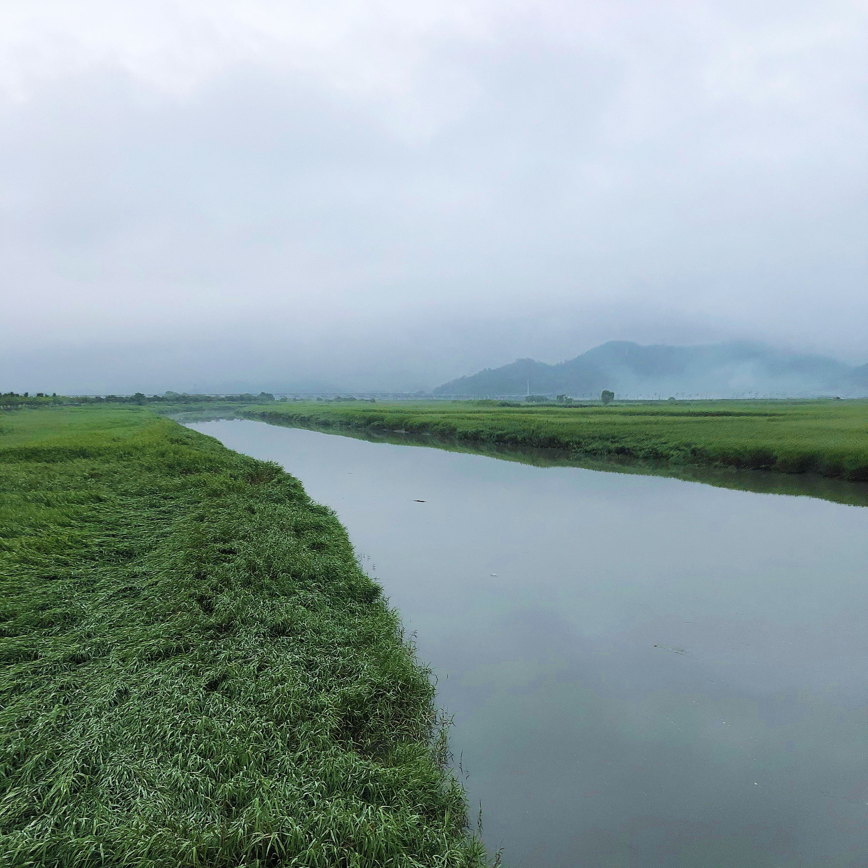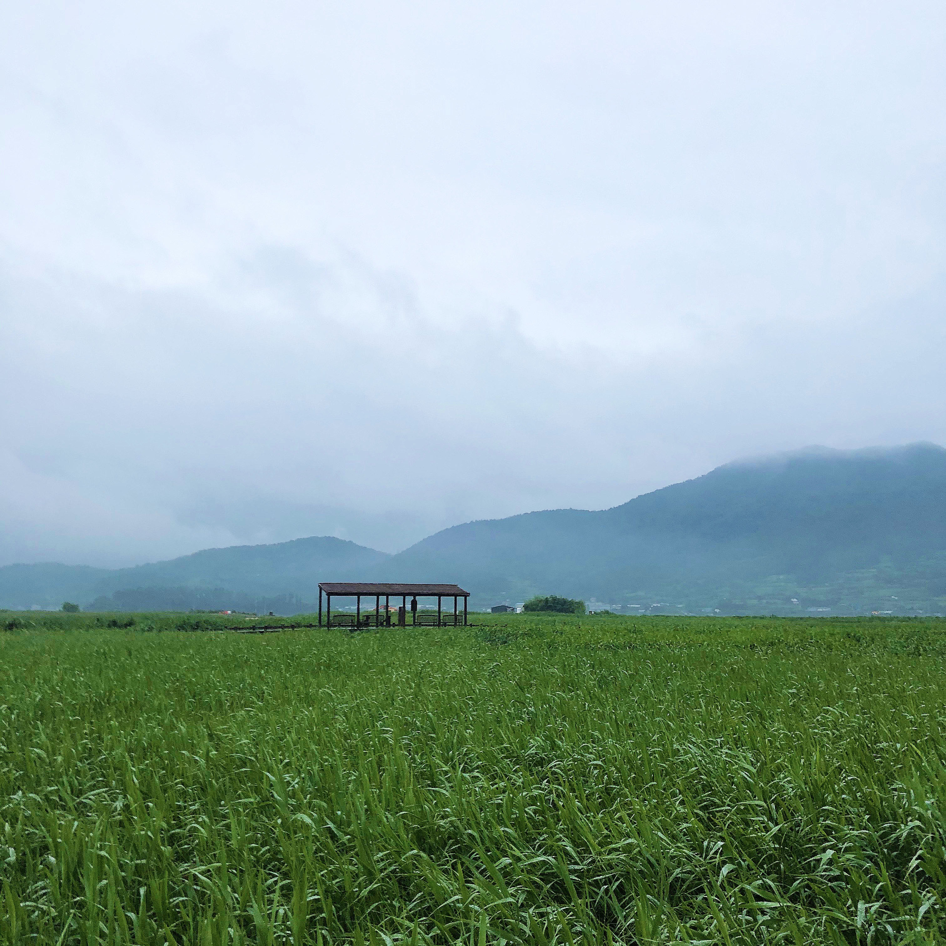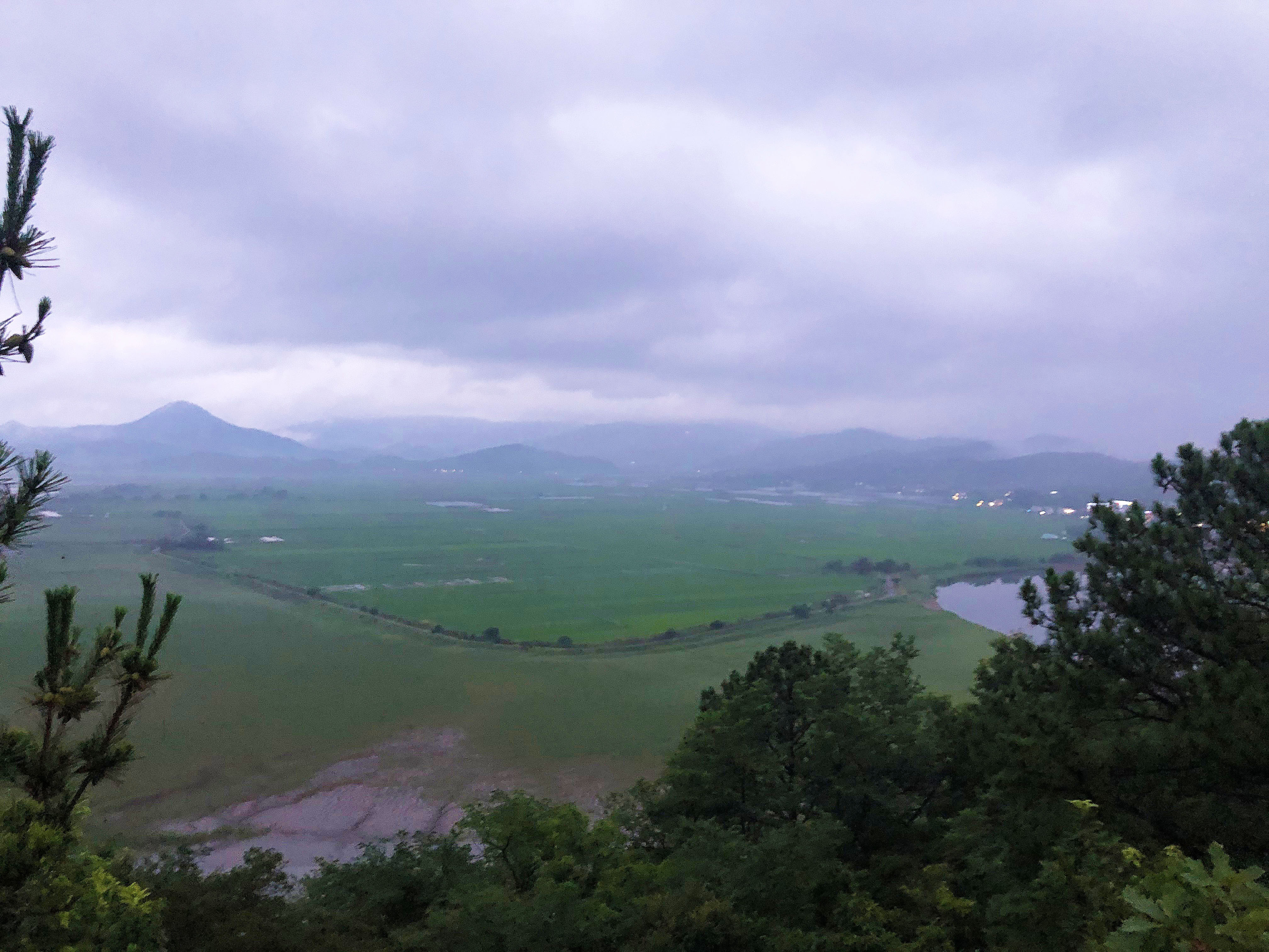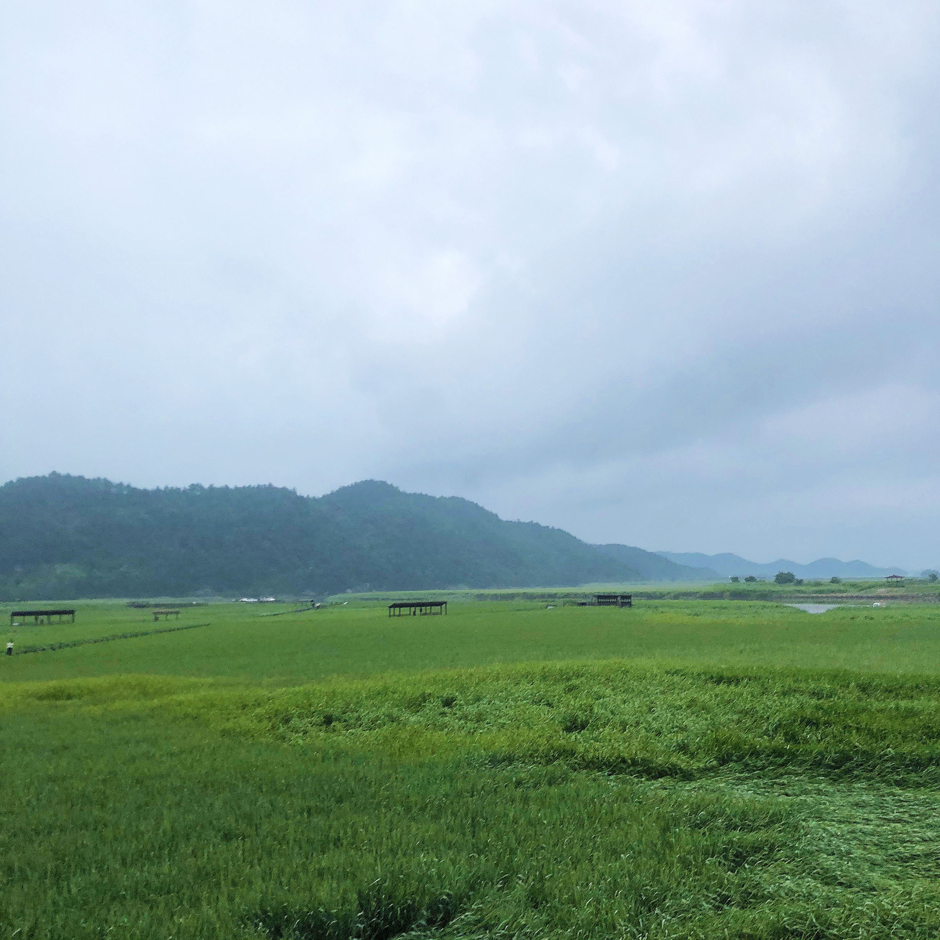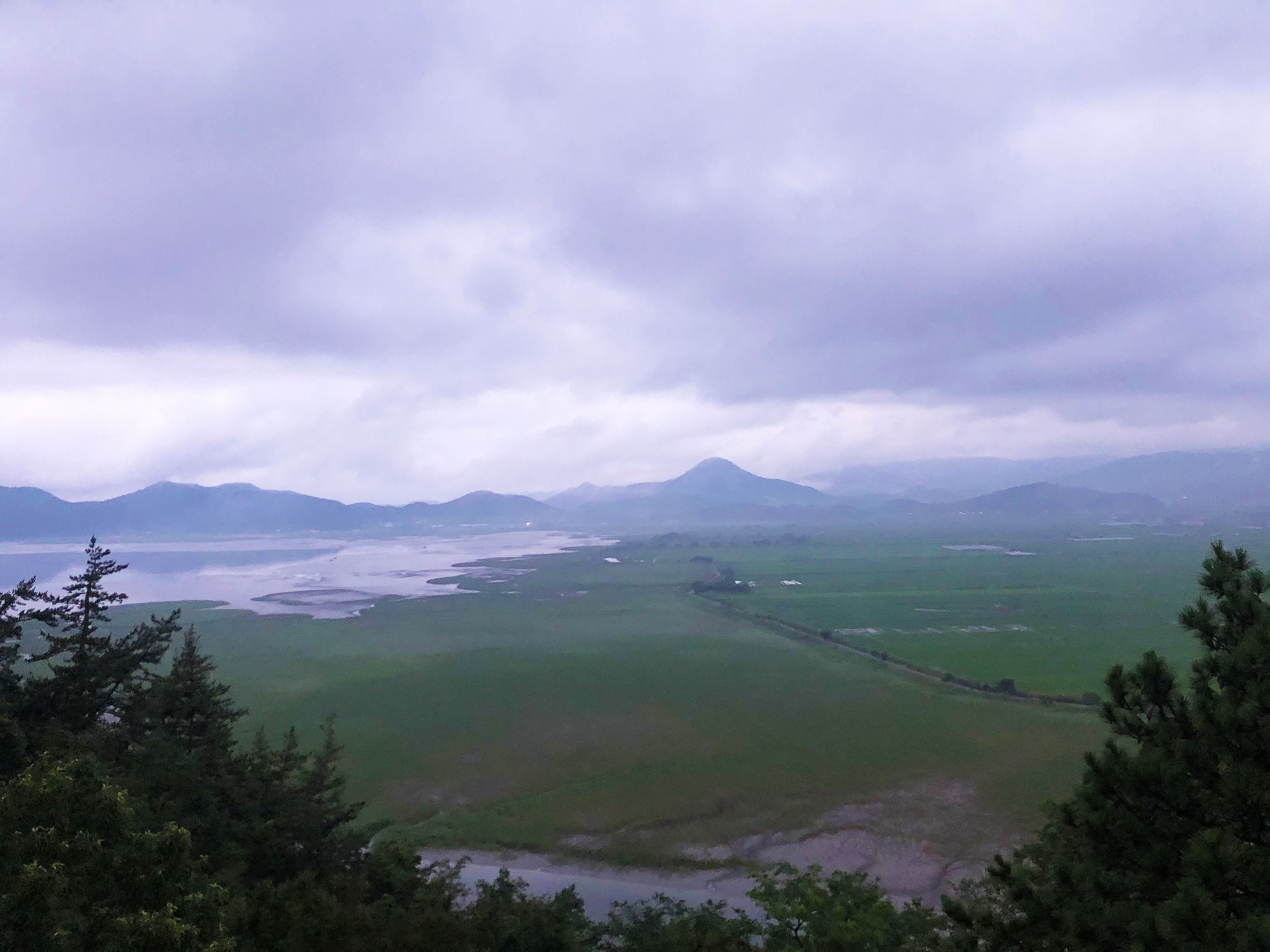 습지와 습지 뒤의 산과 구름이 어우러진 모습은